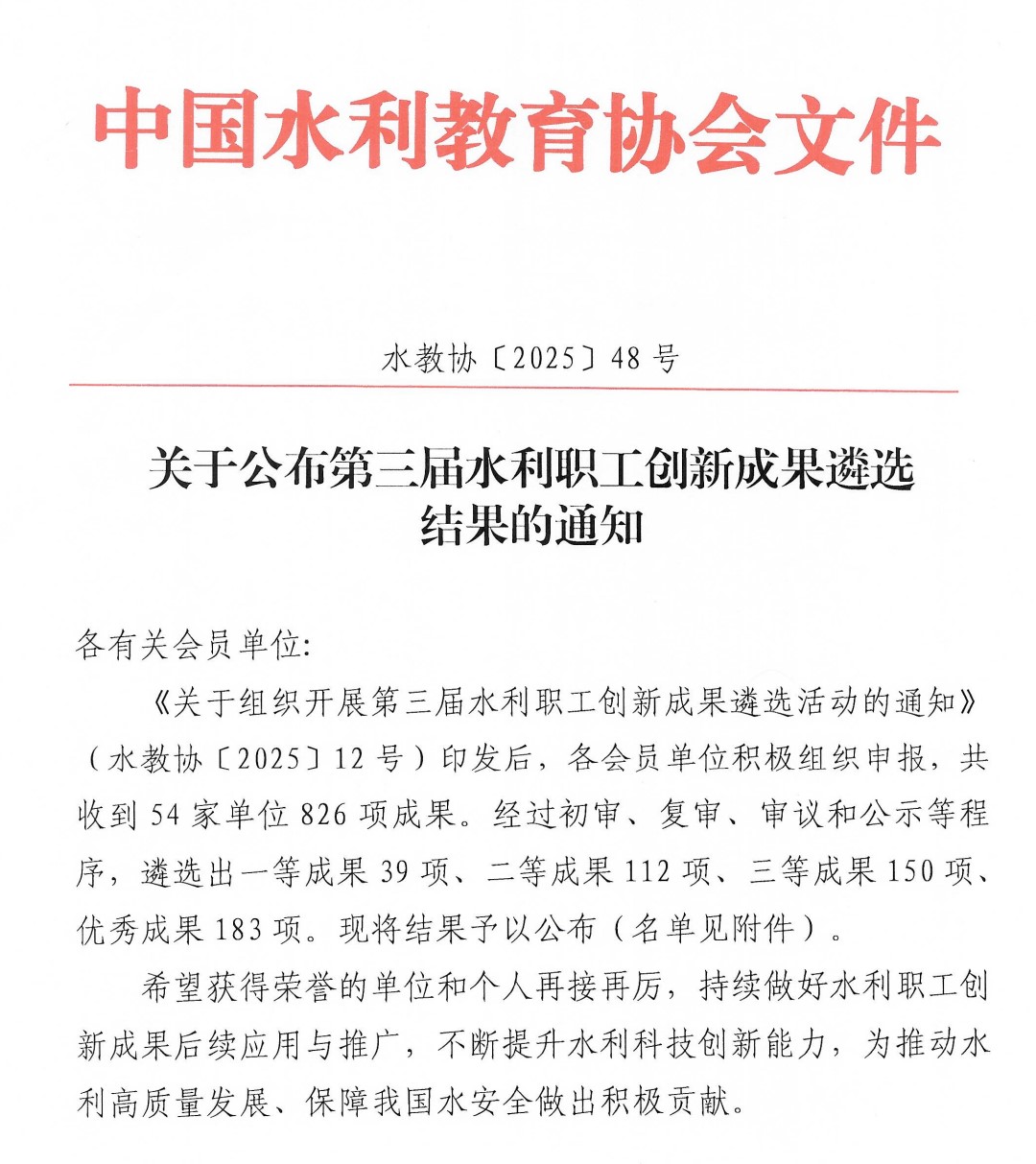 | 公司荣获第三届水利职工创新成果遴选二等成果作者:admin 来源: 日期:2025-12-29 14:14:47 人气: